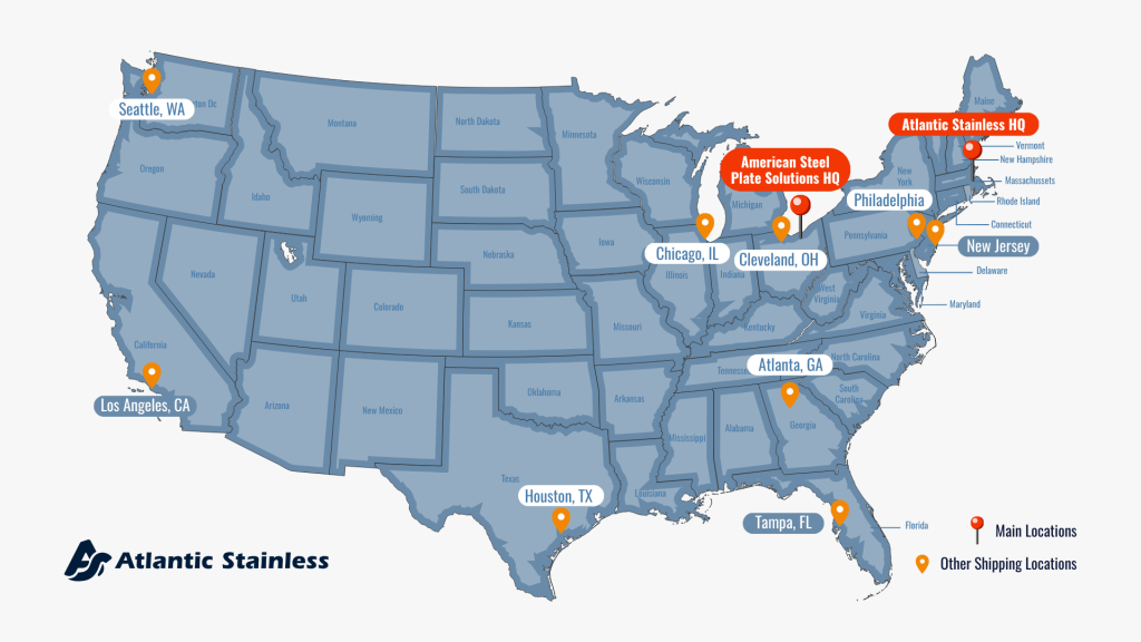 In addition to our own shipping locations, Atlantic Stainless is proud to partner with our sister company, American Steel Plate Solutions, located in Highland Heights, Ohio. Together, we’re able to expand our product capabilities and offer even more value to customers in the Midwest and beyond.
